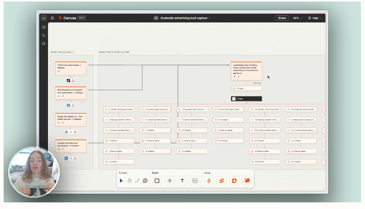 The Canvas below offers an overview of the new system, and there are a couple of things to note. Most importantly, you can see that it’s made up of a few “feeder” Zaps that all funnel into one broader catchall Zap.