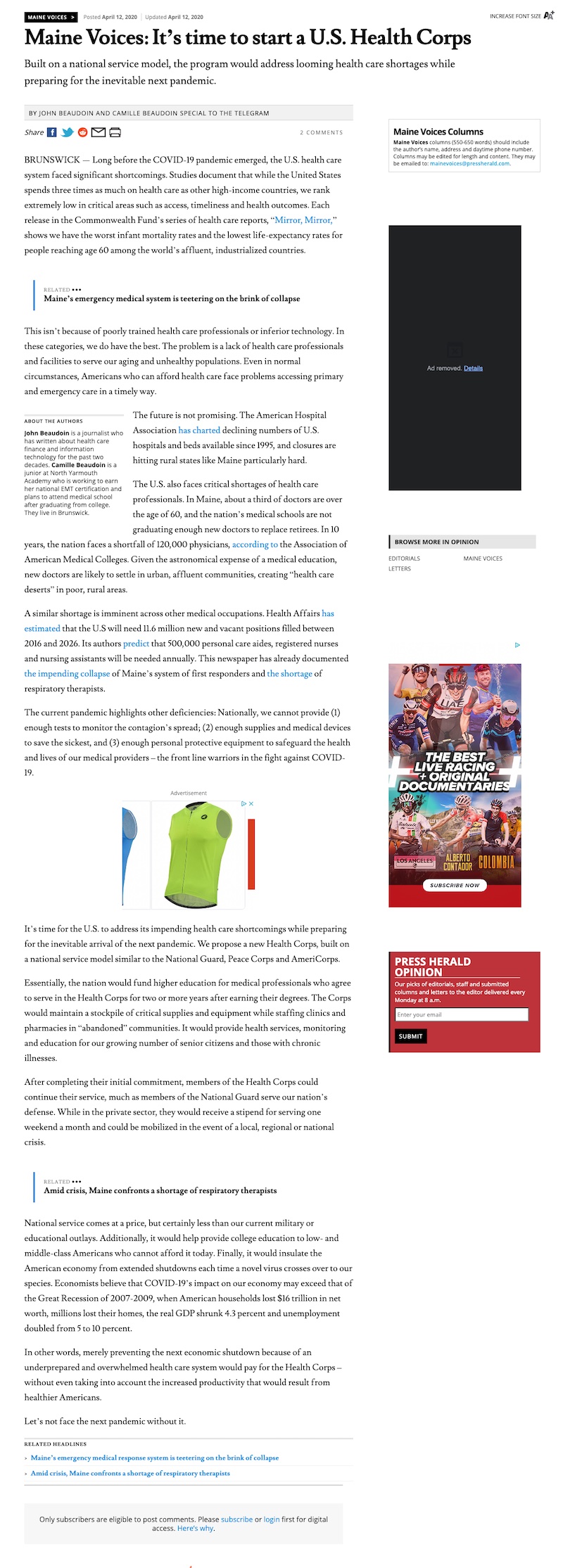 Note: I co-authored this opinion column with my daughter Camille Beaudoin, then a junior in high school with a deep interest in medicine and medical education.
