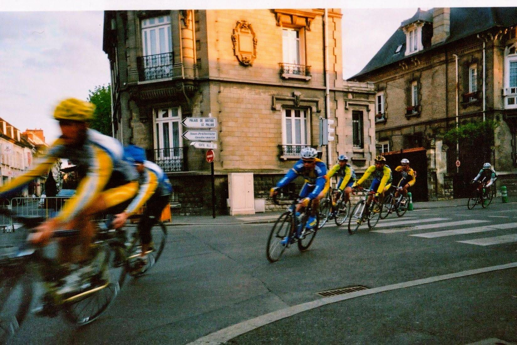 “About 50 or 60 kilometers per hour,” I told him in my best French. “It’s not a big hill they’re descending.”