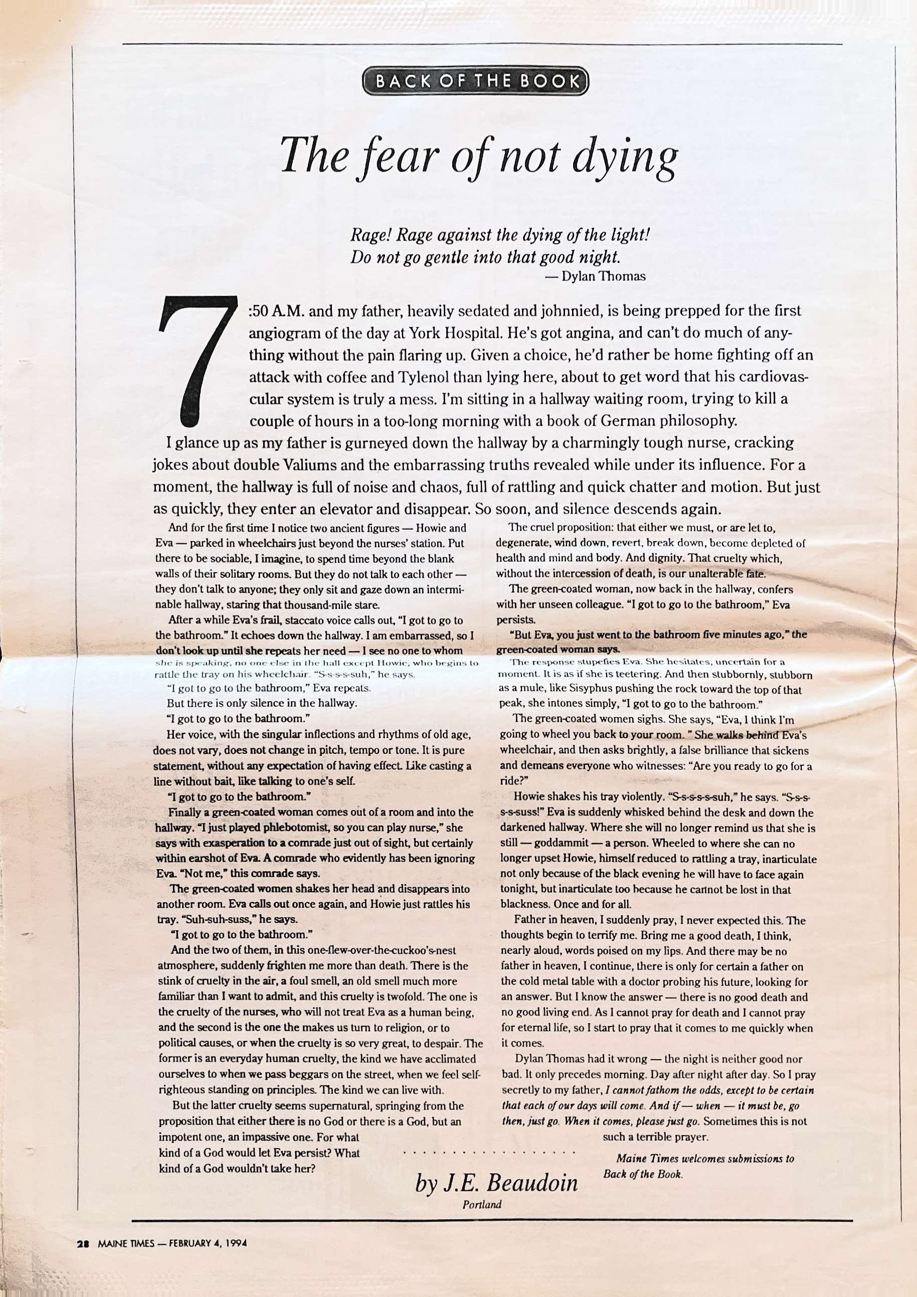 Father in heaven, I suddenly pray, I never expected this. The thoughts begin terrify me. Bring me a good death, I think, nearly aloud, words poised on my lips. And there may be no father in heaven, I continue, there is only for certain my father on the cold metal table with doctor probing his future, looking for an answer. But I know the answer — there is no good death and no good living end. As I cannot pray for death and I cannot pray for eternal life, so I start to pray that it comes to me quickly when it comes.
