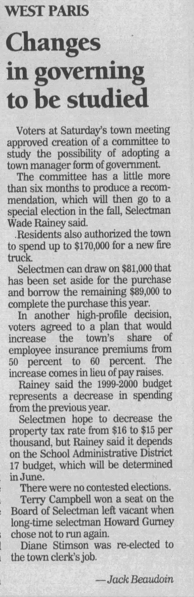 citation: “West Paris Changes in Governing to be studied” Newspapers.com, Portland Press Herald, March 7, 1999, https://pressherald.newspapers.com/article/portland-press-herald-west-paris-changes/127868264/